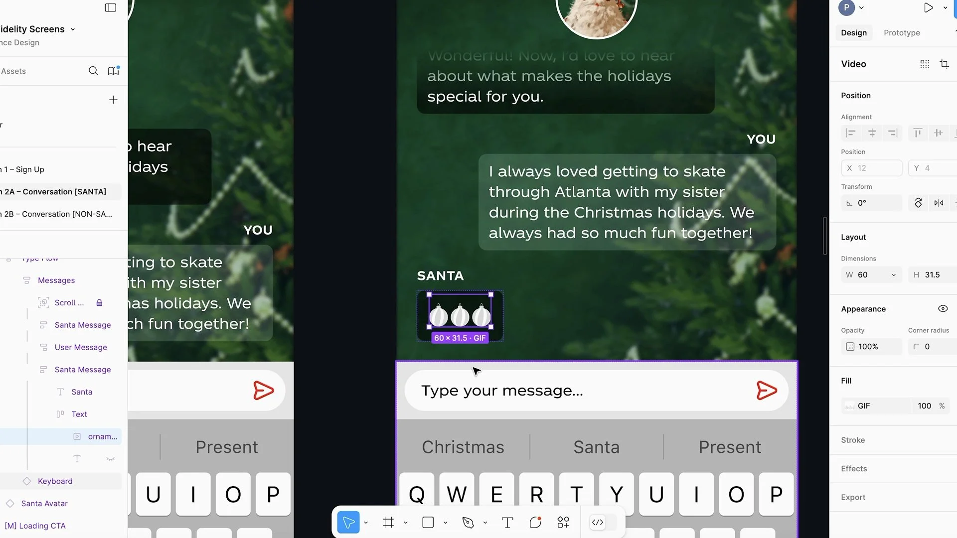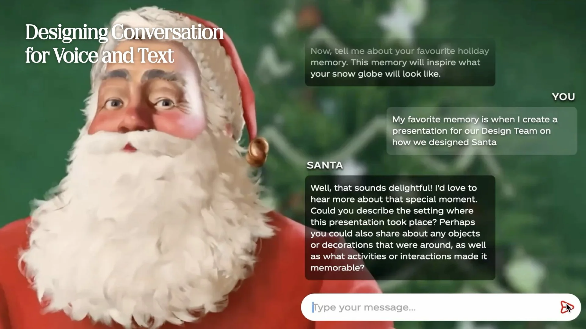 In the chat interface, ornaments visuals from brand guidelines appear as typing elements, adding a subtle festive flair as users wait for Santa’s responses.